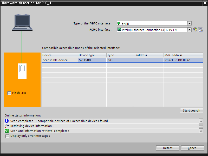 配置当前使用的PG/PC接口的类型和使用的网口,点击【开始搜索(Start search)】。博途会搜索到当前网络所连接的CPU,如下图: